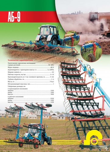 Агрегат бороновальный АБ-9 (полольник). Применяется для борьбы со снежной плесенью в ранне- весениий срок на посевах озимых зерновых культур, для уничтожения сорной растительности в период белых нитей на посевах подсолнечника,кукурузы,яровых зерновых культур. Уничтожения почвенной корки на посевах выше указанных культур. Агрегат применяется для боронования многолетних трав с целью улучшения водно- воздушного режима а также для разрушения кротовин.