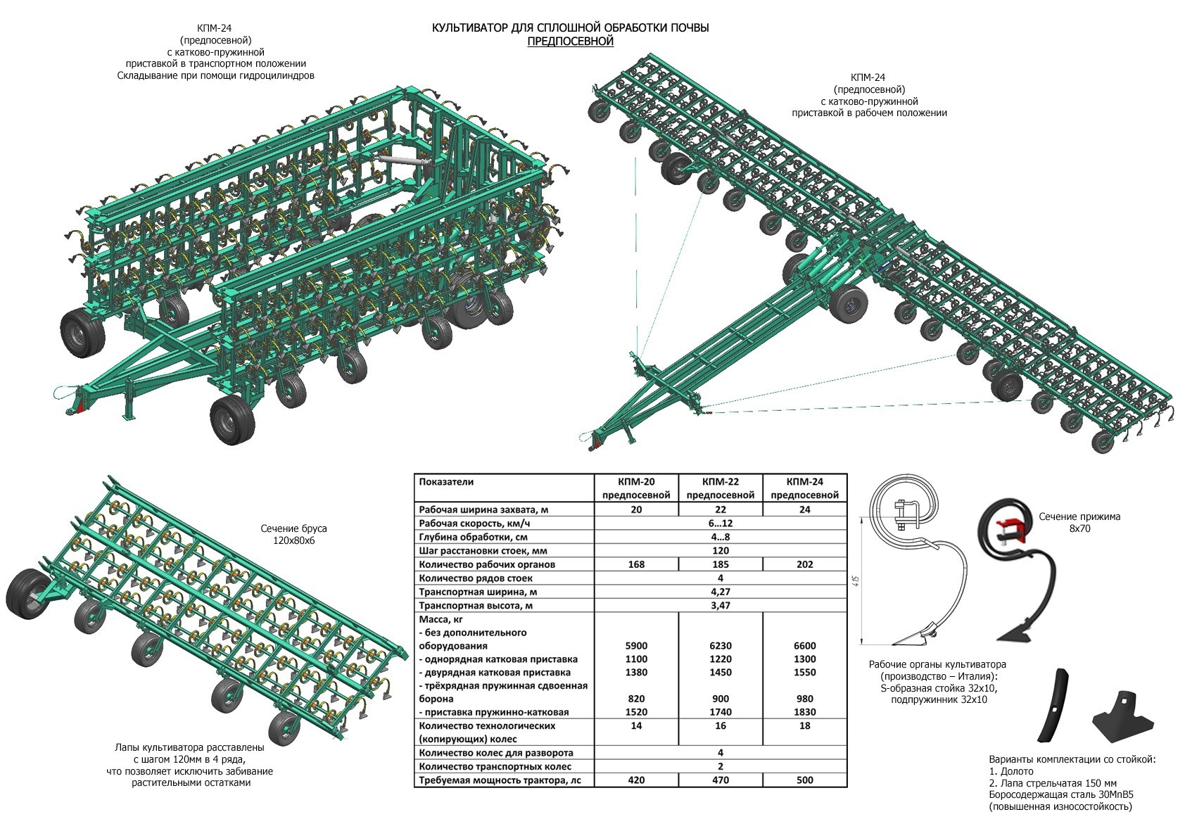 Рабочий орган – S-образная стойка 32х10 с подпружинником (производство – Италия), стрельчатая лапа шириной 150мм. Возможна комплектация культиваторов другими видами рабочих органов.