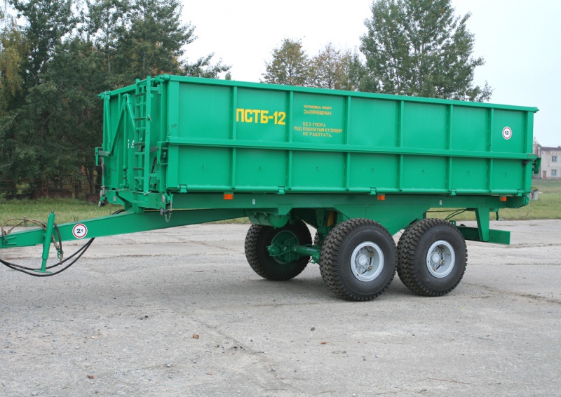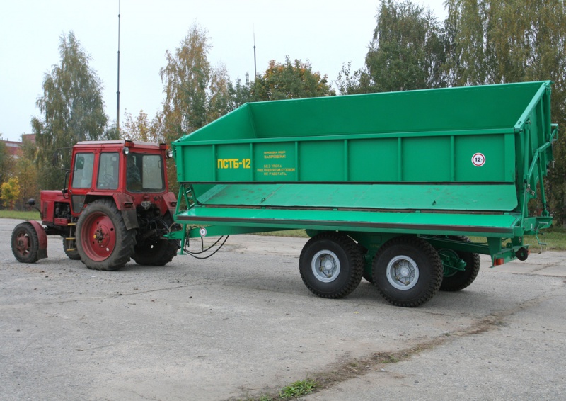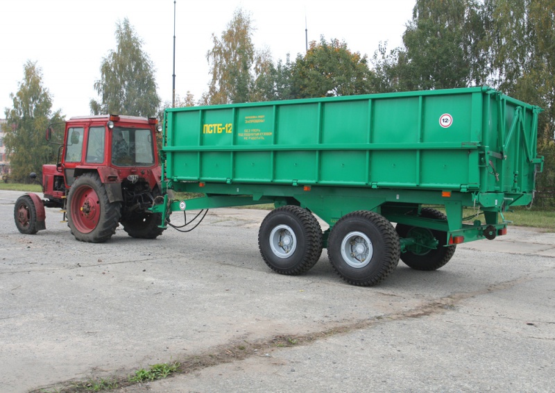 Полуприцеп самосвальный ПСТБ-12 предназначен для транспортировки различных сельскохозяйственных грузов, зерновых, корнеплодов, органических удобрений, строительных материалов и других грузов с выгрузкой на боковые стороны. Полуприцеп имеет балансирную тележку с 4 шинами 16,5/70-18.
