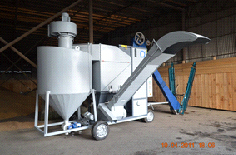 Из бурта материал забирает подборщик, шириной 5 метров. Исходный материалпоступает в бункер-питатель машины АЛМАЗ, далее происходит сепарация материалапо удельному весу по фракциям. Количество используемых фракций зависит от целейочистки – получение товарного зерна, либо подготовка семенного материала. Приочистки исходного материала в режиме подготовки товарного зерна, выгрузка изфракции осуществляется зернометом, что позволяет отгружать очищенный материал вкузов любого грузового автомобиля, бурт. Фуражная фракция (деловой отход)отводится в сторону шнековым погрузчиком (комплектуется при желании заказчика),либо отводится самотечной трубой в сторону и формируется в бурт подсобнымирабочими. Легкие частицы, такие как пыль, солома, полова, улавливаются вциклон.