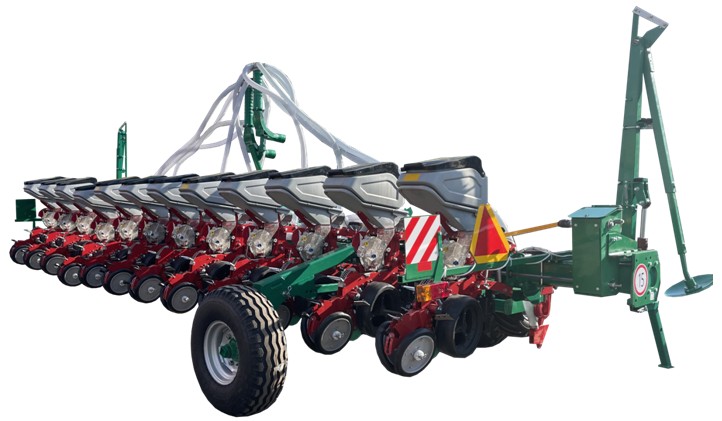 Сеялка предназначена для посева семян кукурузы с возможностью внесения гранулированных минеральных удобрений. Комбинация машины включает в себя бункер удобрений на передней навеске трактора и посевную шину с высевающими секциями на задней навеске трактора.